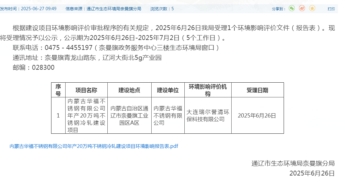 6月27日,通遼市生態環境局奈曼旗分局發布關于內蒙古華福不銹鋼有限公司年產20萬噸不銹鋼冷軋建設項目環境影響評價文件(報告表)受理情況的公示,公示期為2025年6月26日-2025年7月2日(5個工作日)。