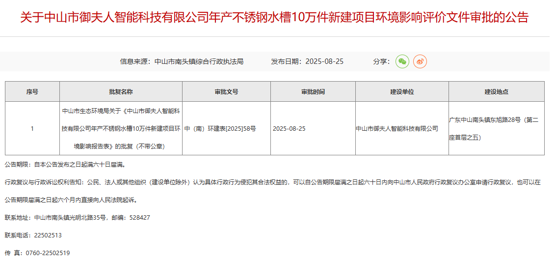2025年8月25日,中山市南頭鎮綜合行政執法局就中山市御夫人智能科技有限公司年產不銹鋼水槽10萬件新建項目環境影響評價文件作出審批意見并對外公告,公告期限:自本公告發布之日起滿六十日屆滿。