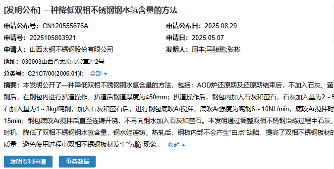 8月29日,山西太鋼不銹鋼股份有限公司成功申請一項名為“一種降低雙相不銹鋼鋼水氫含量的方法”專利,申請公布號為CN120555676A,申請日期為2025年5月7日。